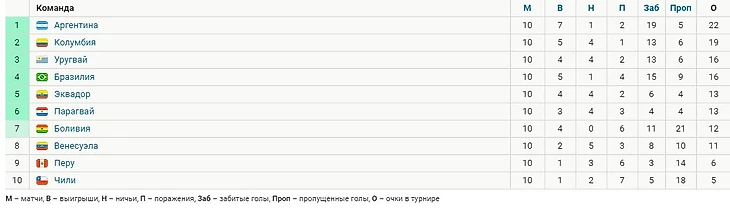 Эквадор билан 0:0 ҳисобида ўйнаган Уругвай ва Боливияни мағлуб этган (6:0) Бразилия 16 очкодан жамғарган.