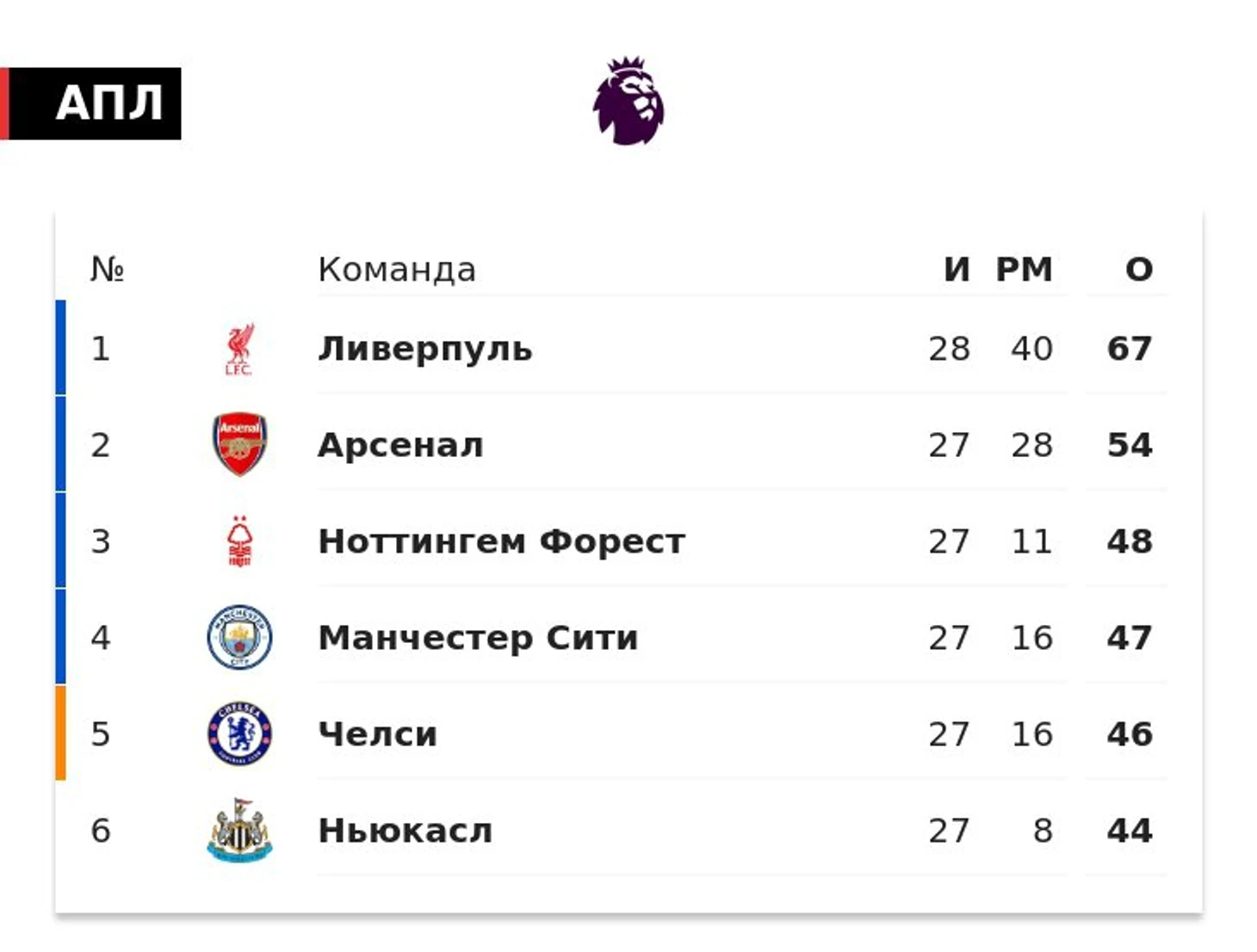 Шунингдек, ҳозирча кучли тўртликдан "Ноттингем" (48) ва "Манчестер Сити" (47) жой олган.