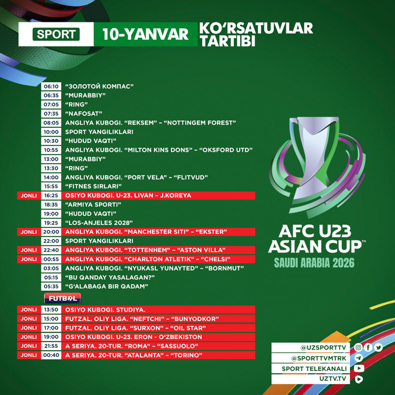 Sport ва Futbol телеканаллари бугун — 2026 йил 10-январь, шанба куни қуйидаги кўрсатув ва трансляцияларни эфирга узатишни режалаштирган.
