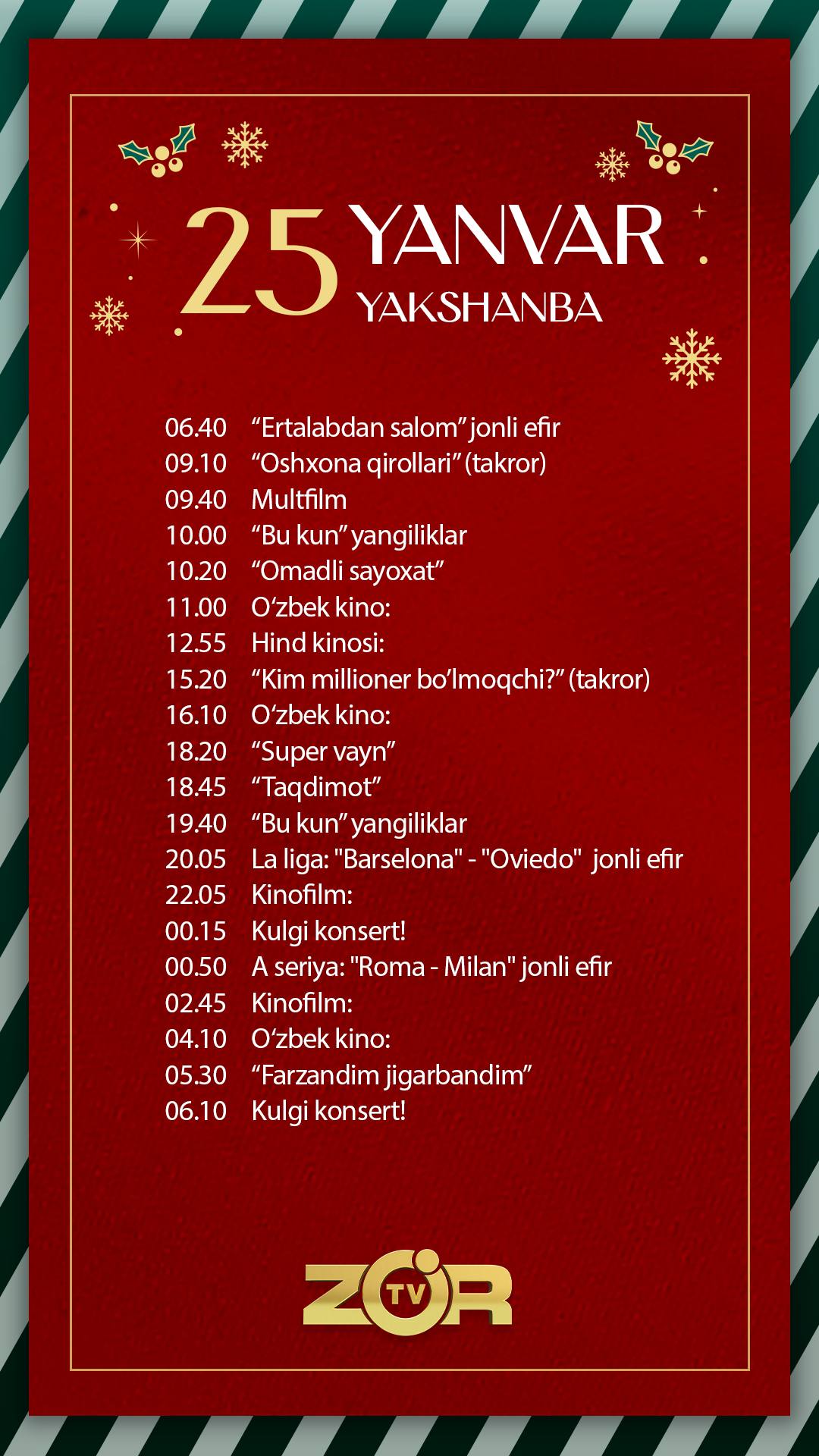 Zo'r TV телеканали бугун — 2026 йил 25-январь, якшанба куни қуйидаги кўрсатув ва трансляцияларни эфирга узатишни режалаштирган.