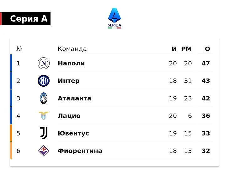 Неаполликлар Италия чемпионатида 20 ўйиндан кейин 47 очко билан пешқадамлик қилмоқда. "Интер" 18 учрашувда 43 очко билан иккинчи ўринда бормоқда. "Аталанта" 19 ўйиндан кейин 42 очкога эга. "Лацио" 20 ўйиндан сўнг 36 очко билан кучли тўртликни якунлаб турибди.