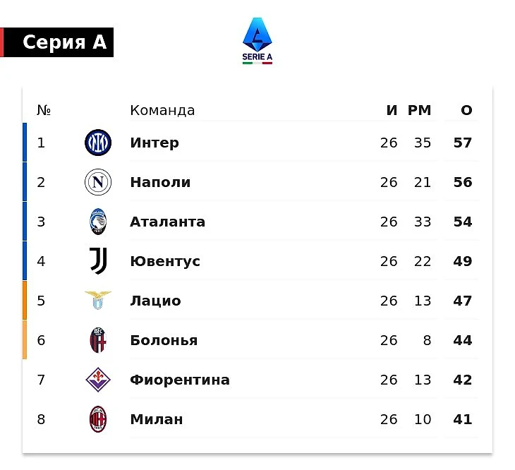 "Россонерилар" ўтказилган 26 ўйиндан сўнг 41 очко билан турнир жадвалининг 8-поғонасидан жой олган. "Милан" пешқадам "Интер"дан 16 очко ортда қолмоқда.