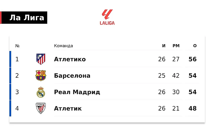 Испания чемпионатининг 26-турида "Атлетико" "Атлетик"ни мағлуб этди (1:0), "Реал" эса "Бетис"га ютқазди (1:2).
