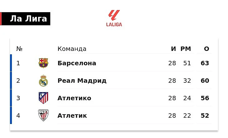 Шунингдек, "Атлетико" 56 очко ва "Атлетик" 52 очко билан кучли тўртликдан жой олган.