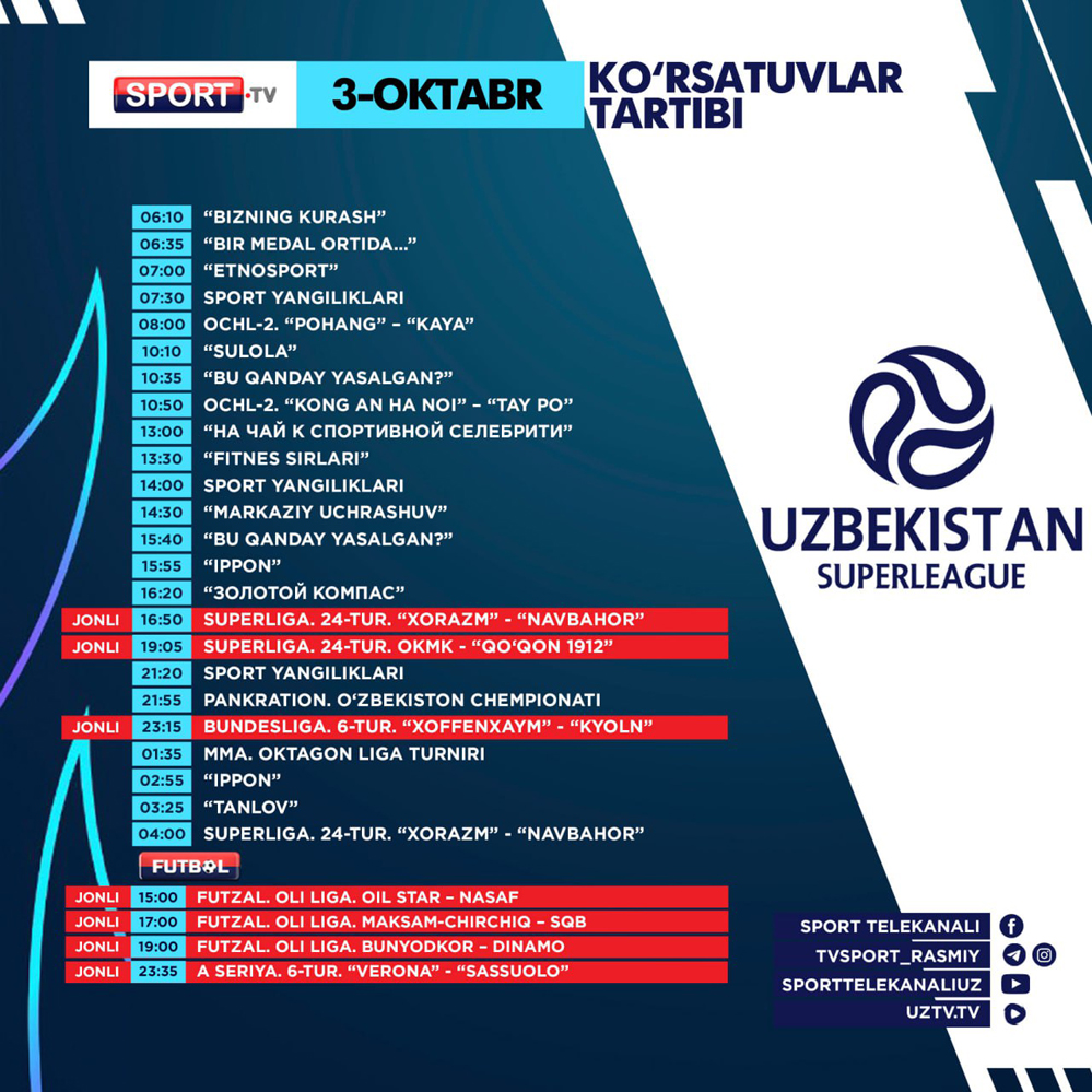 Sport ва Futbol телеканаллари бугун — 2025 йил 3-октябрь, жума куни қуйидаги кўрсатув ва трансляцияларни эфирга узатишни режалаштирган.
