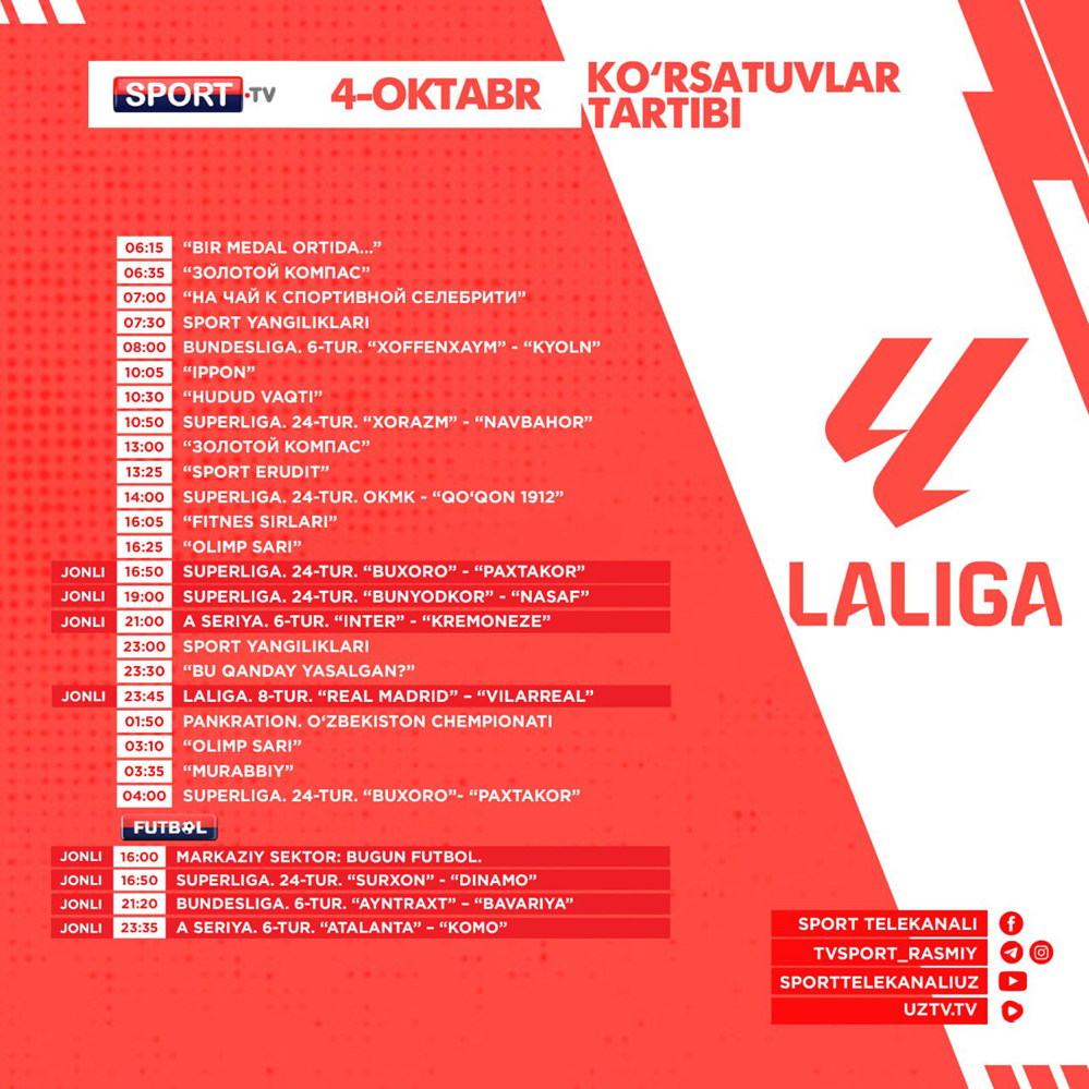 Sport ва Futbol телеканаллари бугун — 2025 йил 4-октябрь, шанба куни қуйидаги кўрсатув ва трансляцияларни эфирга узатишни режалаштирган.
