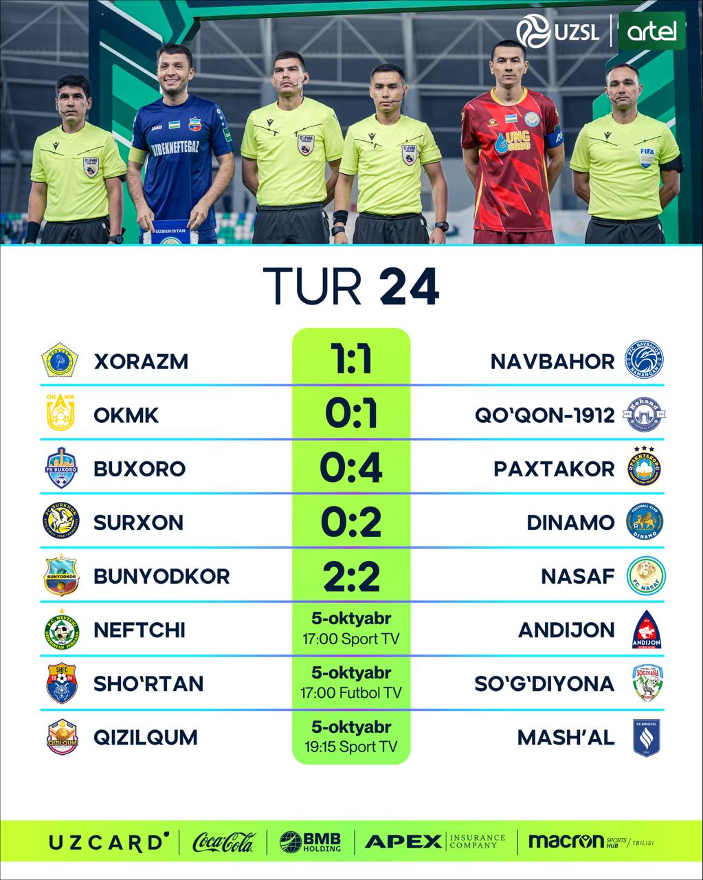 "Динамо" "Сурхон"ни (2:0), "Пахтакор" "Бухоро"ни (4:0) мағлуб этди. Пешқадам "Насаф" Тошкентда "Бунёдкор" билан дуранг ўйнади - 2:2.