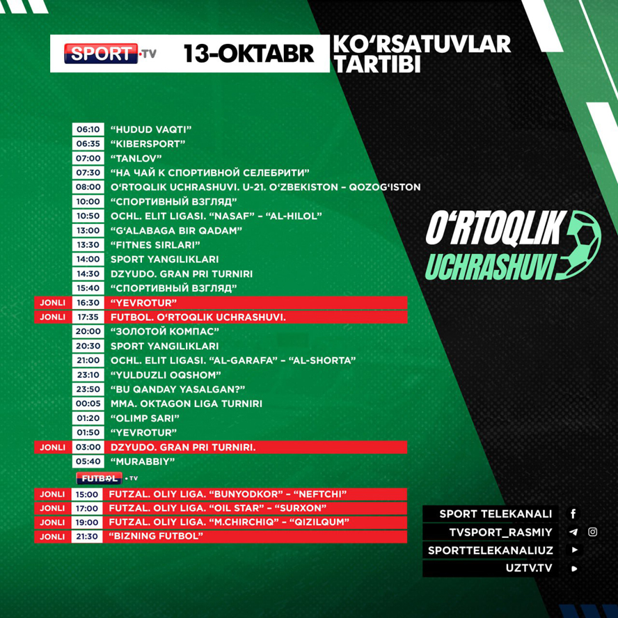 Sport ва Futbol телеканаллари бугун — 2025 йил 13-октябрь, душанба куни қуйидаги кўрсатув ва трансляцияларни эфирга узатишни режалаштирган.