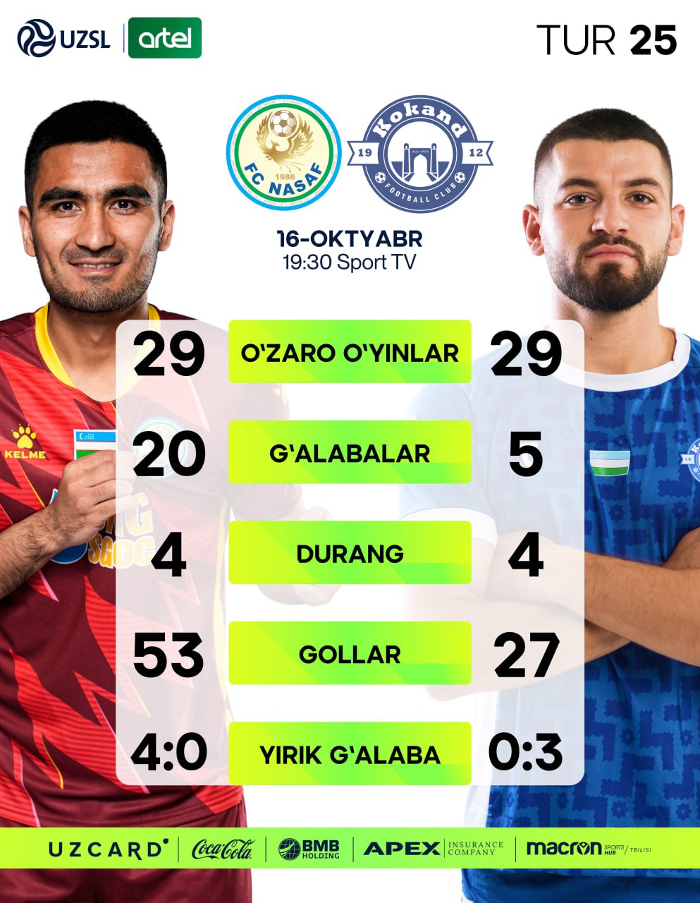 Бугун, 16 октябрь куни Суперлига пешқадами "Насаф" 25-турнинг илк ўйинида "Қўқон-1912"ни қабул қилади.