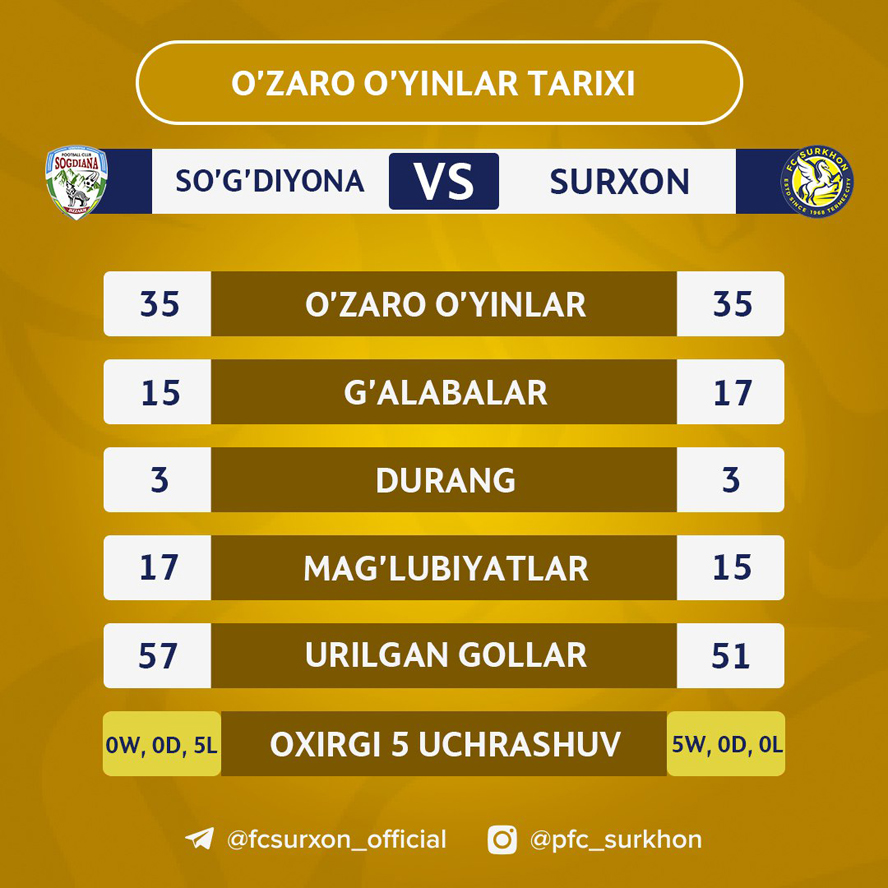 Жиззахнинг «Сўғдиёна»си турнир жадвалида «Сурхон»дан атиги 3 очкога олдинда туришибди. Бу дегани, агар «Сурхон» ғалаба қозонса, нафaқат рақибни қувиб етади, балки ўзаро ўйинлар ҳисобига «Сўғдиёна»ни орқада қолдириши ҳам мумкин.