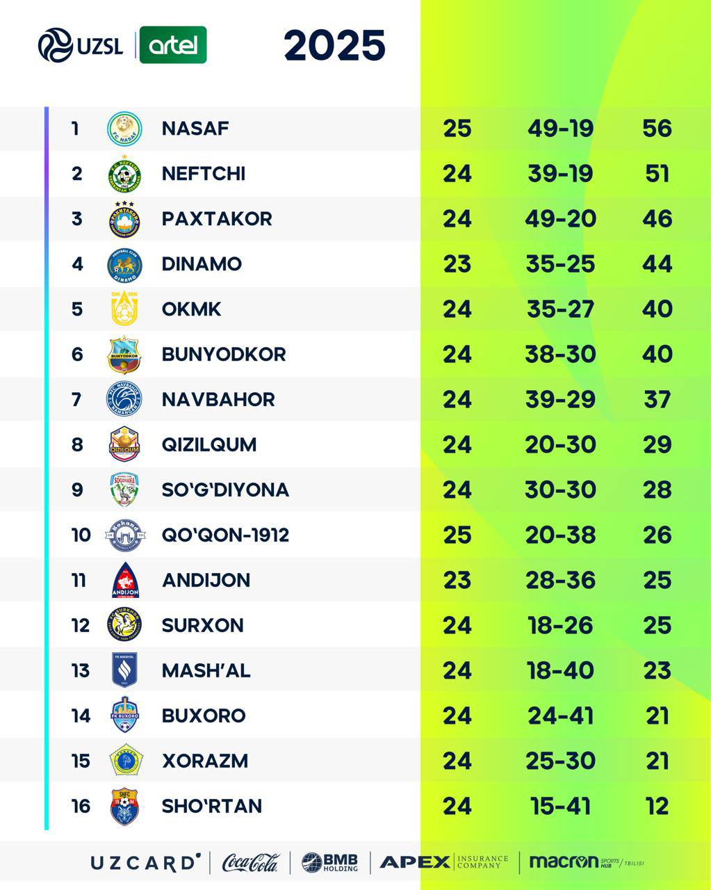 Суперлигада 25-тур ўйинлари давом этади.