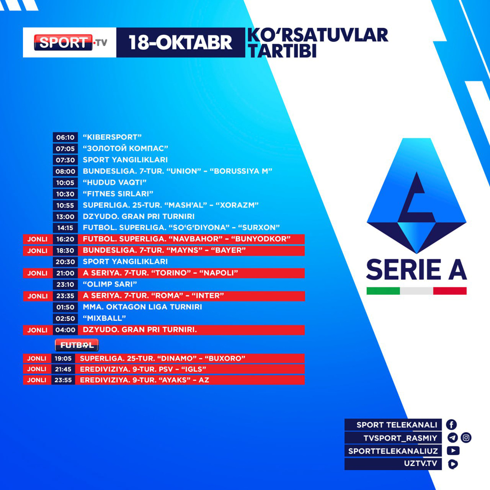 Sport ва Futbol телеканаллари бугун — 2025 йил 18-октябрь, шанба куни қуйидаги кўрсатув ва трансляцияларни эфирга узатишни режалаштирган.