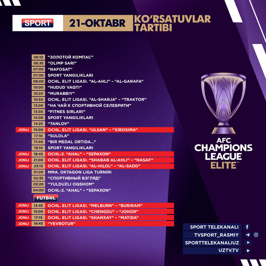 Sport ва Futbol телеканаллари бугун — 2025 йил 21-октябрь, сешанба куни қуйидаги кўрсатув ва трансляцияларни эфирга узатишни режалаштирган.