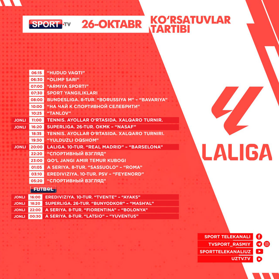 Sport ва Futbol телеканалларида 26-октябрь куни «эл-класико» ва 5 та жонли футбол трансляцияси бор