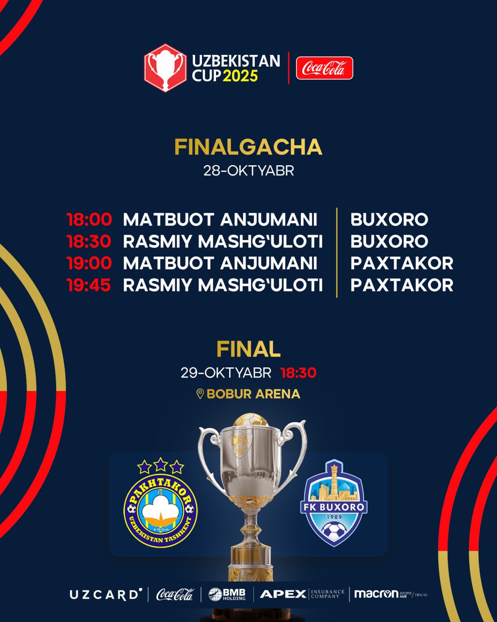 Ўзбекистон кубоги. Бугун "Бобур арена"да ўйинолди расмий тадбирлар ўтказилади