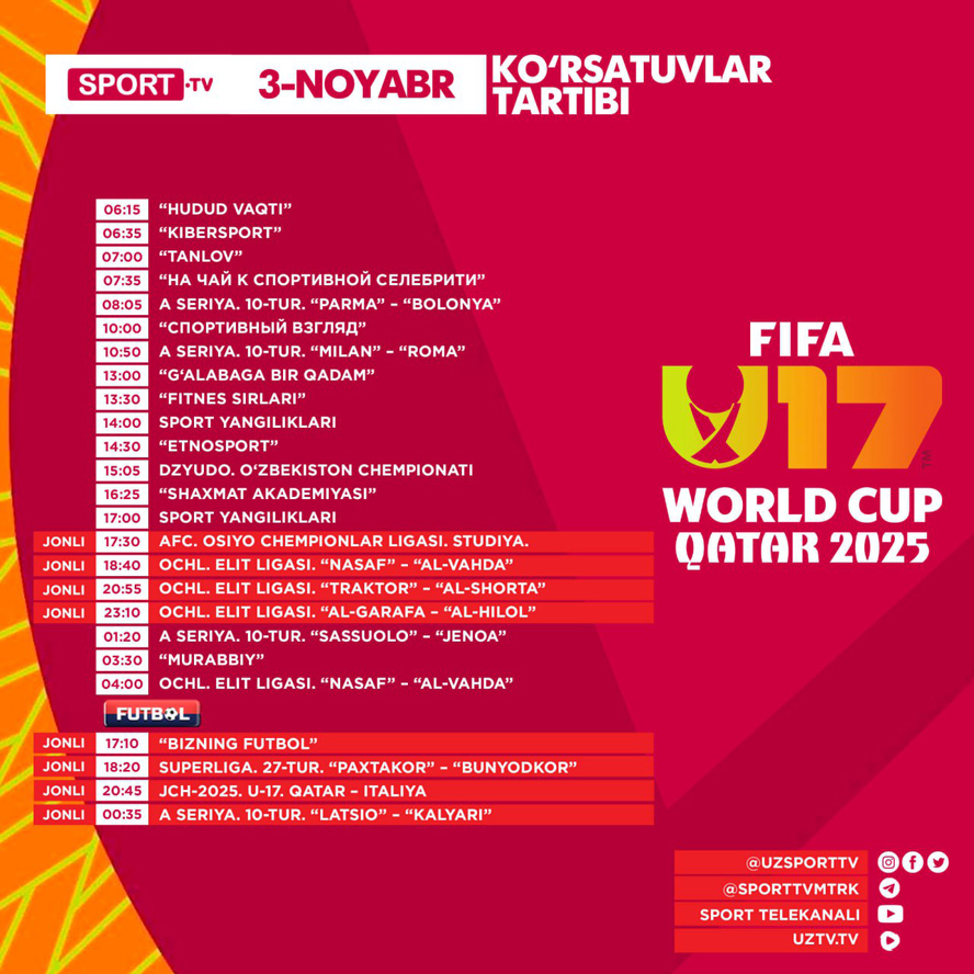 Sport ва Futbol телеканалларида 3-ноябрь куни 6 та жонли футбол трансляцияси бор [1446]