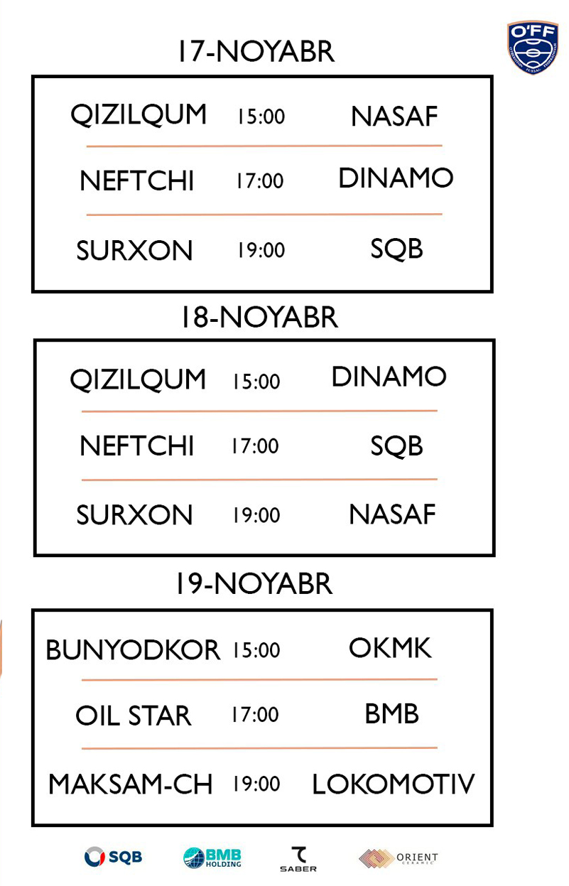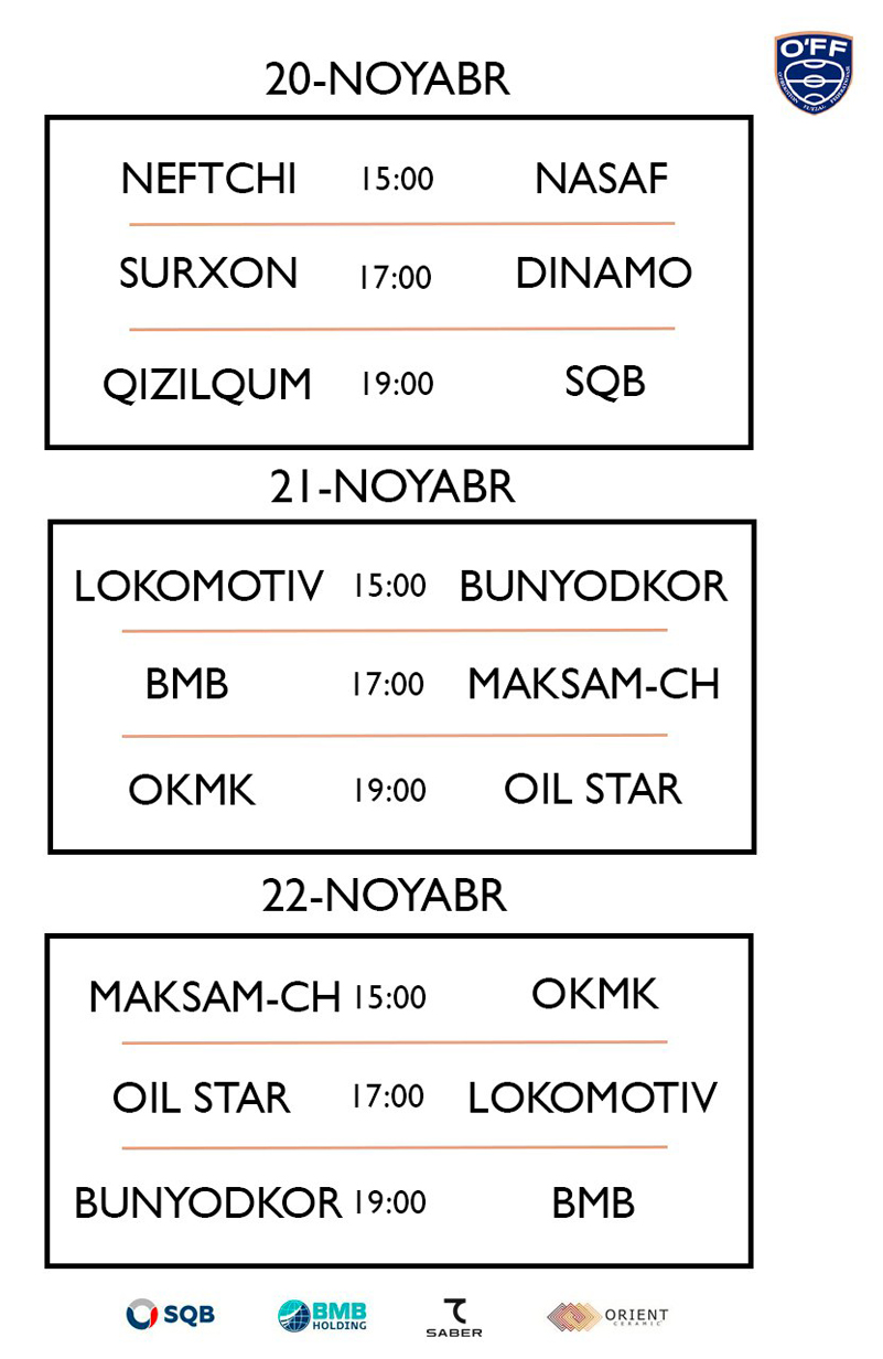 Мамлакат миллий чемпионати – Олий лига жамоаларининг 5-тур учрашувлари жорий йилнинг 17 – 22 ноябрь кунлари Бухоро шаҳрида бўлиб ўтади. Турга 2024 йилги Жаҳон чемпионати ўйинларини қабул қилган муҳташан «Универсал» спорт мажмуаси мезбонлик қилади.