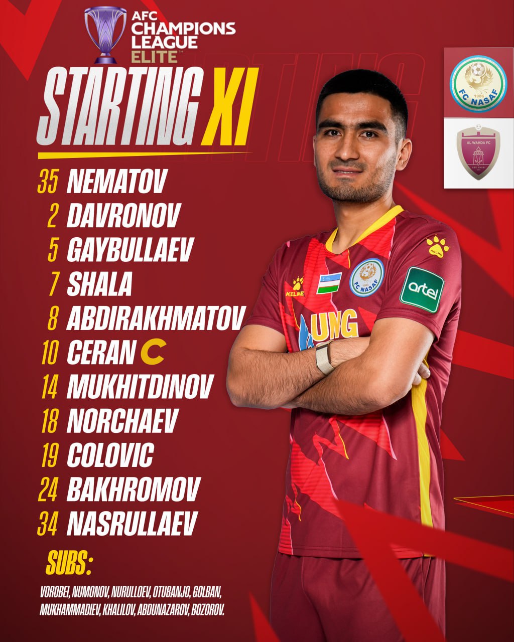 "Насаф" Элит Чемпионлар лигаси 4-туридан ўрин олган "Ал-Ваҳда"га қарши ўйин учун асосий таркибини эълон қилди.