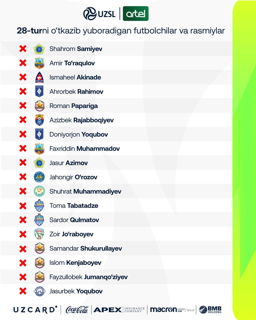 ЎЗБЕК ФУТБОЛИ / Суперлига / Дисквалификациялар