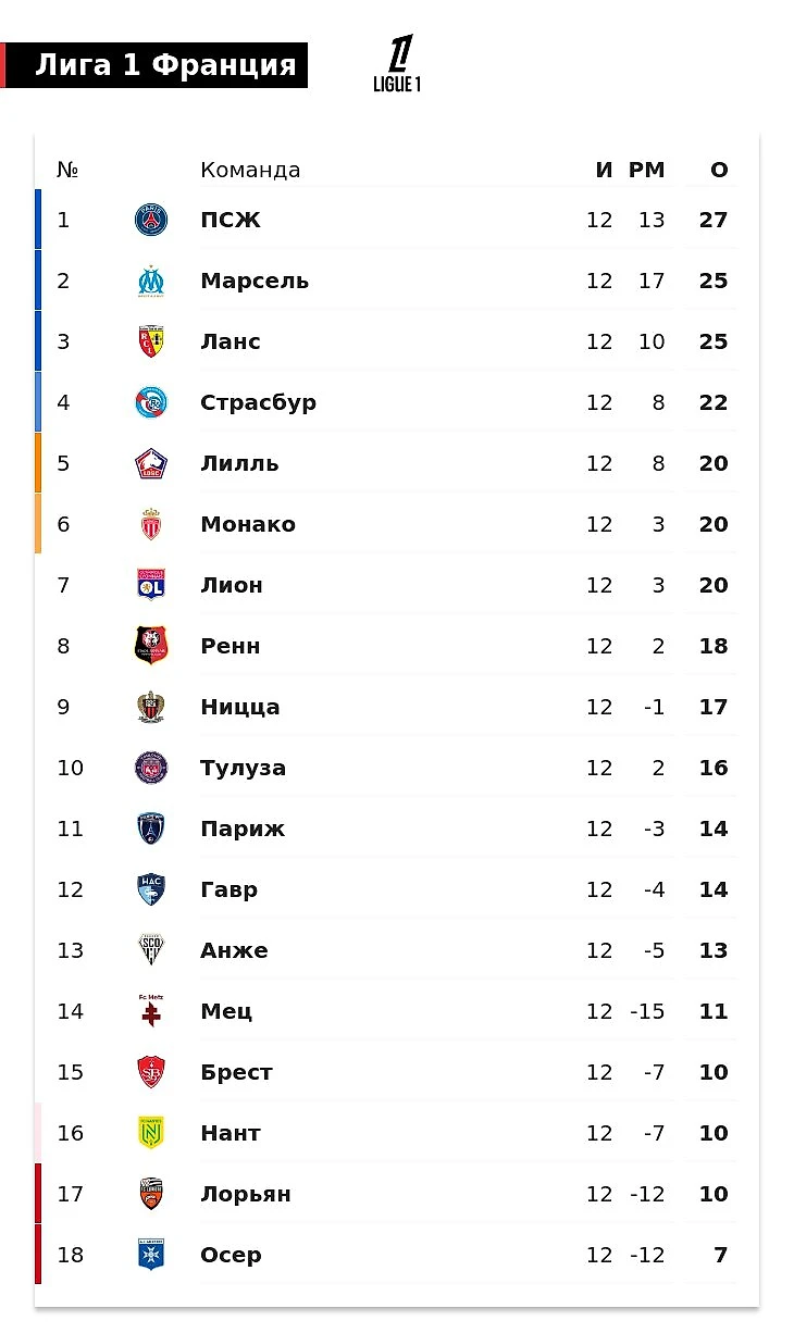"Страсбур" 22 очко билан 4-поғонадан жой олган бўлса, "Лилль" 5-ўрин ва 20 очкога эга, "Монако" 20 очко билан 6-ўринда бормоқда.