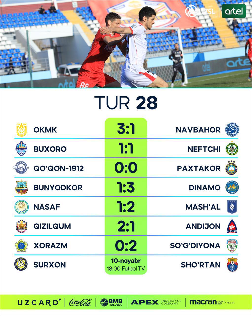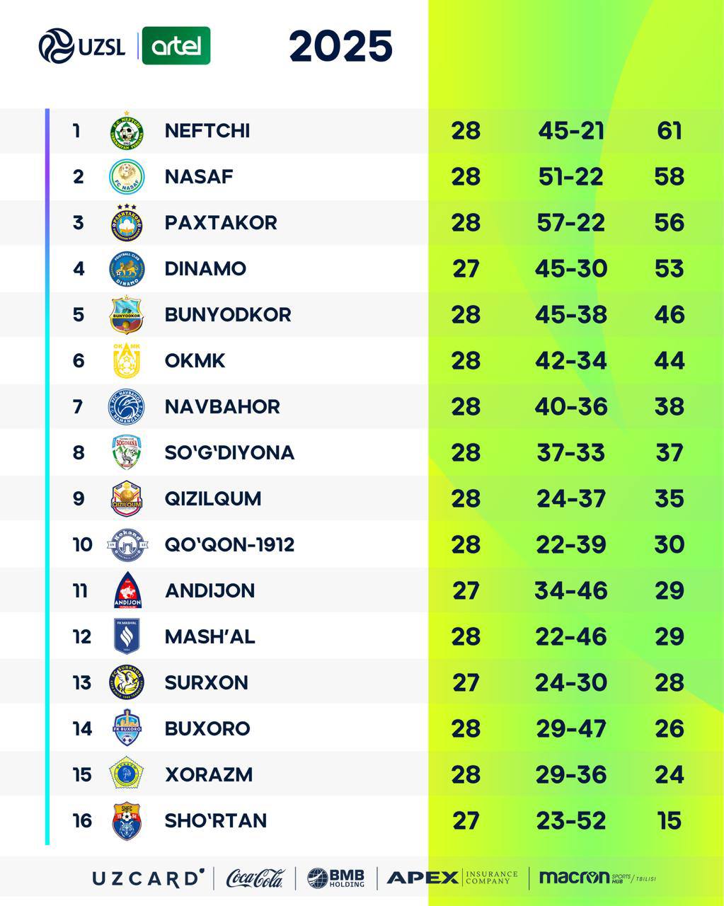 Суперлига. 28-турнинг навбатдаги икки ўйинидан сўнг турнир жадвалидаги ҳолат билан танишинг (фото) [1434]