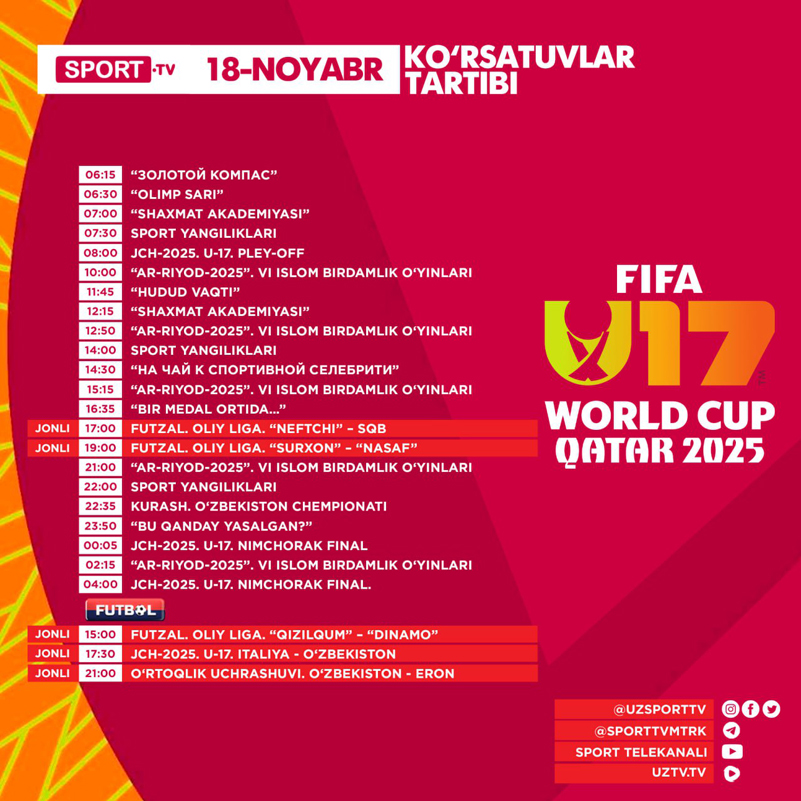 Sport ва Futbol телеканалларида 18-ноябрь куни Ўзбекистон U17 - Италия U17, Ўзбекистон-Эрон ҳамда 3 та футзал трансляцияси бор