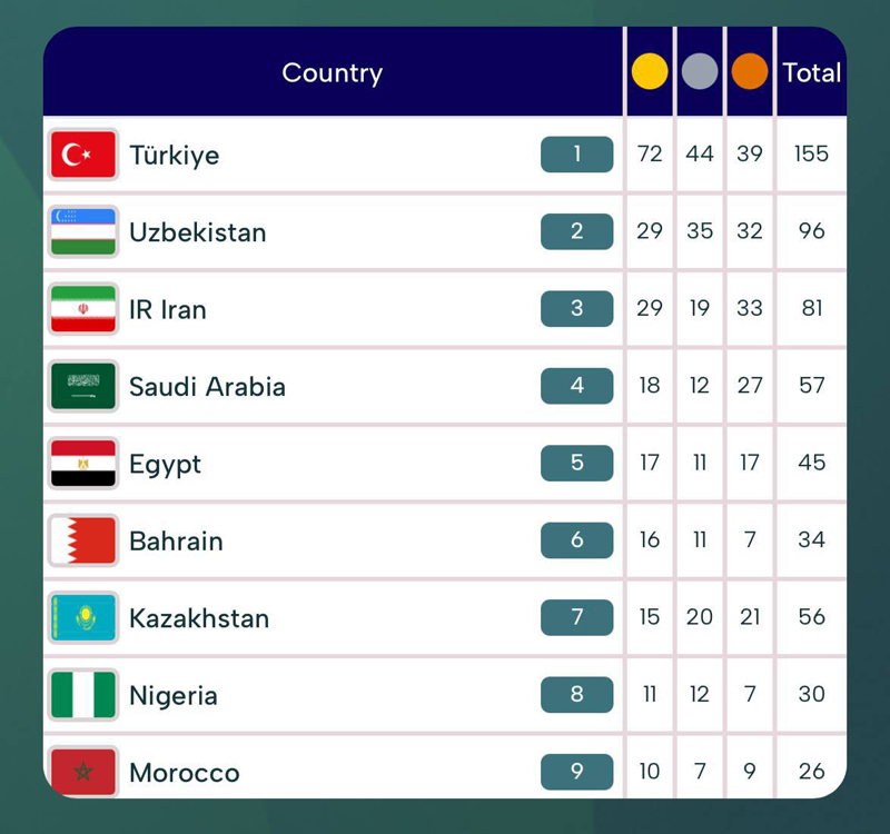 Мусобақа натижаларига кўра Ўзбекистон терма жамоаси 29 та олтин, 35 та кумуш ва 32 та бронза жами 96 та медални қўлга киритиб, умумий ҳисобда Туркиядан кейин иккинчи ўринни эгаллади.