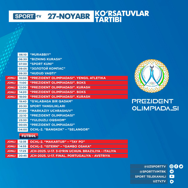 Sport ва Futbol телеканалларида 25-ноябрь куни Президент олимпиадаси ҳамда 4 та футбол трансляцияси бор