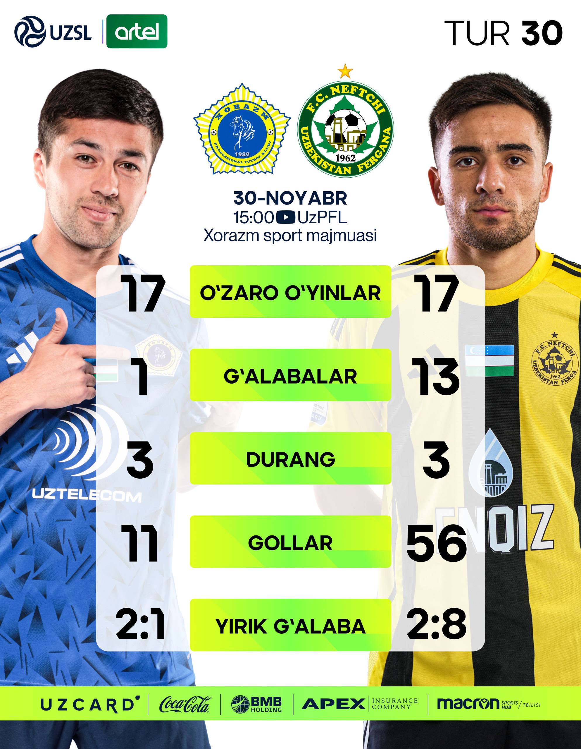 Суперлиганинг якуний 30-турида "Хоразм" ўз майдонида "Нефтчи"ни қабул қилади.