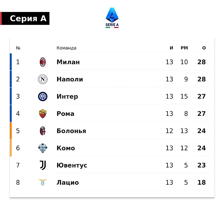"Интер" "Рома" каби пешқадамлардан бир очко ортда қолмоқда. Ундан кейинги ўринларда "Болонья" (24), "Комо" (24) ва "Ювентус" (23) бормоқда.