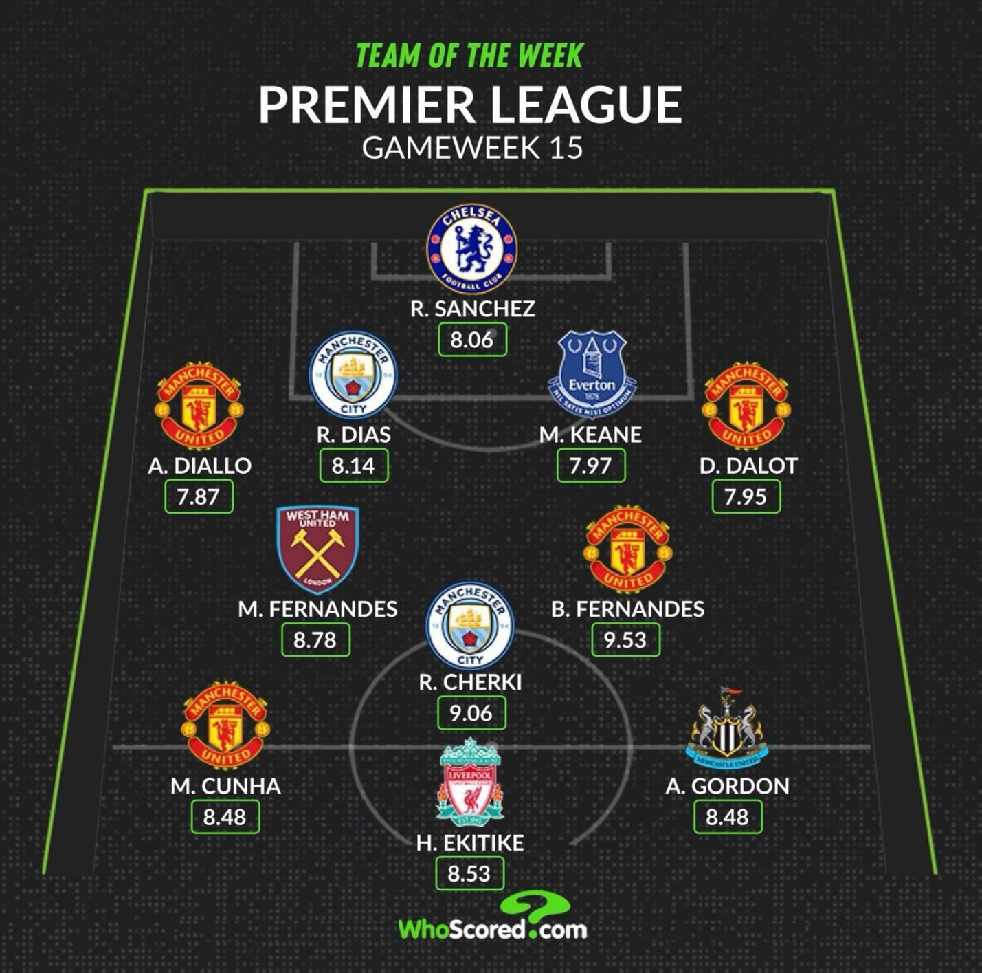 WhoScored статистик-портали Англия Премьер-лигасининг 15-туридаги ўйинларда ўз позициясида энг юқори балл тўплаган футболчилардан иборат рамзий жамоа тузиб чиқди.