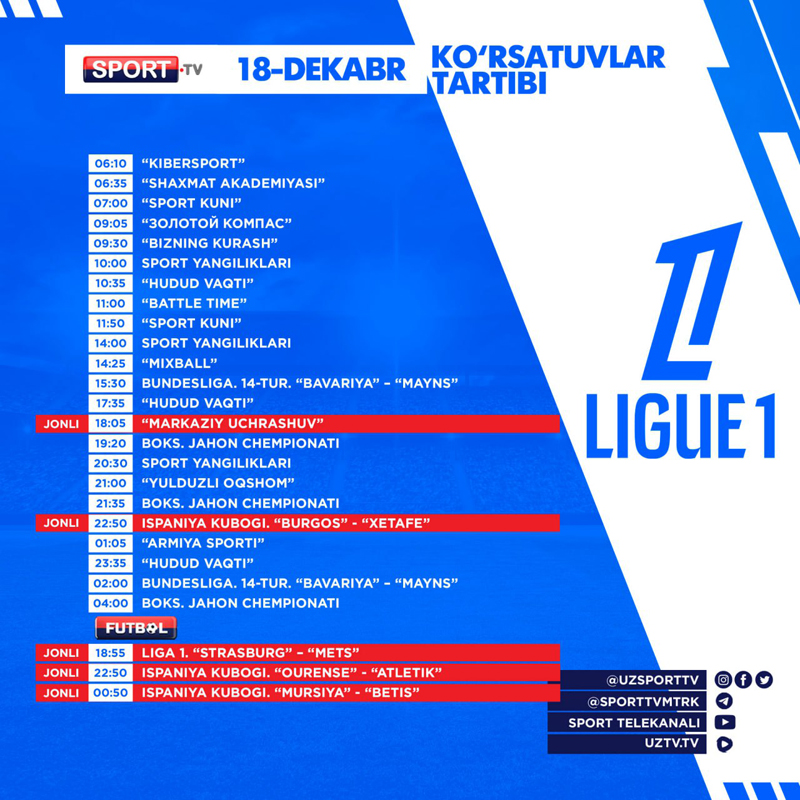 Sport ва Futbol телеканаллари бугун — 2025 йил 18-декабрь, пайшанба куни қуйидаги кўрсатув ва трансляцияларни эфирга узатишни режалаштирган.