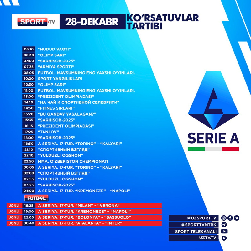 Sport ва Futbol телеканаллари бугун — 2025 йил 28 декабрь, якшанба куни қуйидаги кўрсатув ва трансляцияларни эфирга узатишни режалаштирган.