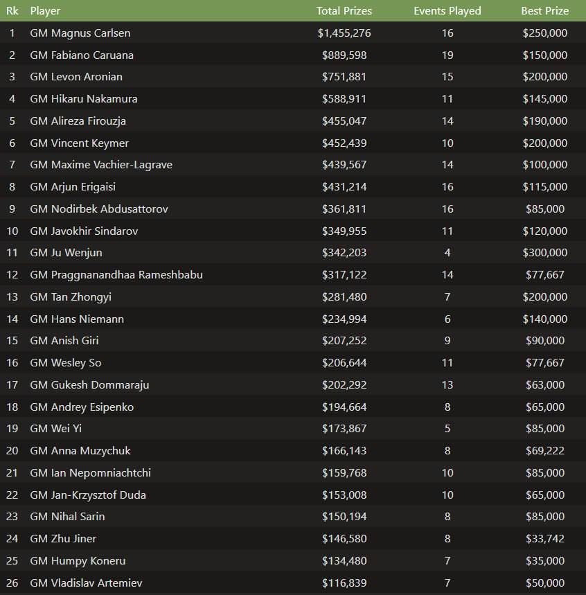 Дунёнинг биринчи рақамли гроссмейстери Магнус Карлсен 2025 йил давомида энг кўп мукофот қўлга киритган шахматчига айланди. У йил давомида 16 та турнирда иштирок этиб, жами 1 миллион 455 минг доллар мукофот қўлга киритган. Иккинчи поғонадан Фабиано Каруана жой олди (889 минг 598 доллар). Кучли учликни эса 751 минг 881 доллар билан Левон Арониан якунлаган.