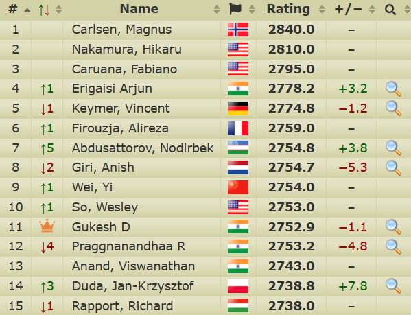 Ўзбекистоннинг биринчи рақамли шахматчиси Нодирбек Абдусатторов FIDE онлайн рейтингида 2755 очко билан 7-ўринга кўтарилди.