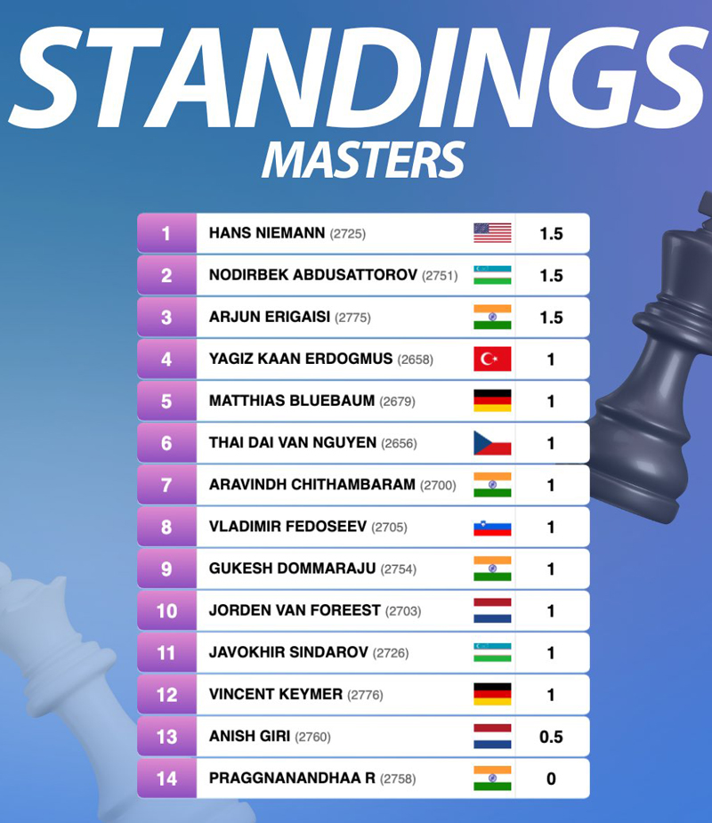 Мусобақанинг Masters гуруҳи иккинчи кун баҳслари доирасида ўзбекистонлик гроссмейстер Нодирбек Абдусатторов оқ доналарда ҳиндистонлик шахматчи Прагнанандҳа Рамешбабуни мағлуб этди.