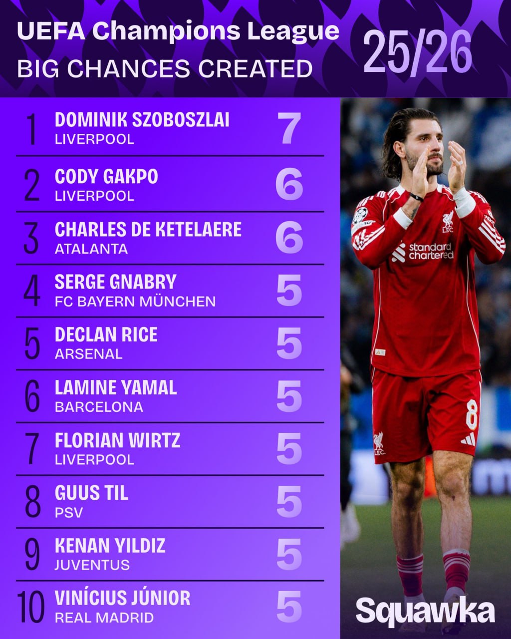 "Ливерпуль" ҳужумкор ярим ҳимоячиси Доминик Собослаи Чемпионлар лигаси жорий мавсумида 7 та голли имконият яратган ҳолда бу борада турнирда энг яхши кўрсаткич қайд этмоқда.