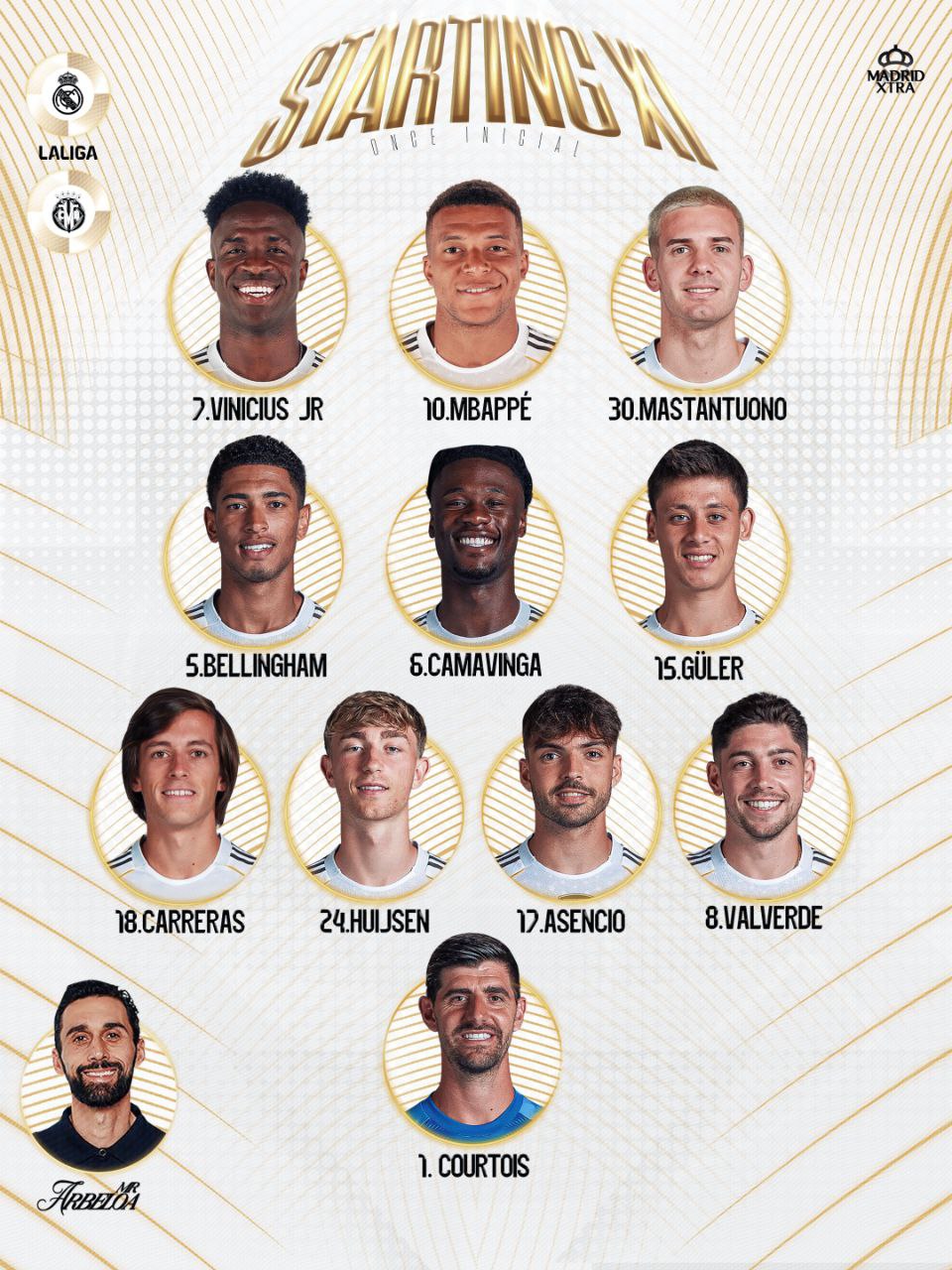 Реал: Куртуа, Вальверде, Асенсио, Хёйсен, Каррерас, Гюлер, Камавинга, Беллингем, Мастантуоно, Винисиус, Мбаппе