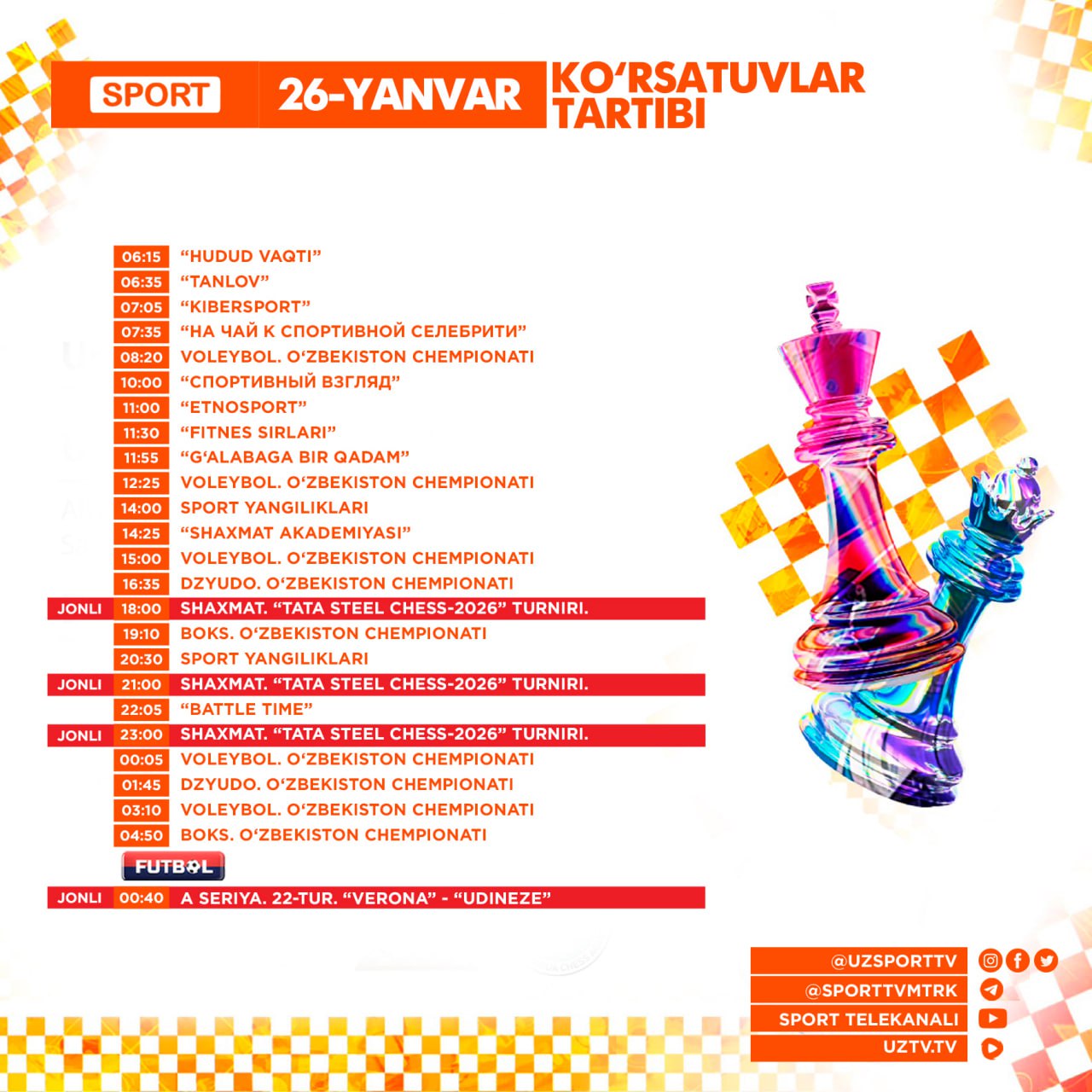 Sport ва Futbol телеканаллари бугун — 2026 йил 26-январь, душанба куни қуйидаги кўрсатув ва трансляцияларни эфирга узатишни режалаштирган.