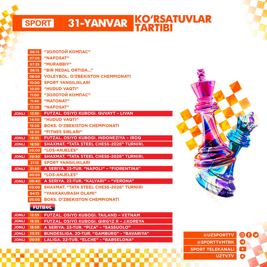 Sport ва Futbol телеканаллари бугун — 2026 йил 31-январь, шанба куни қуйидаги кўрсатув ва трансляцияларни эфирга узатишни режалаштирган.