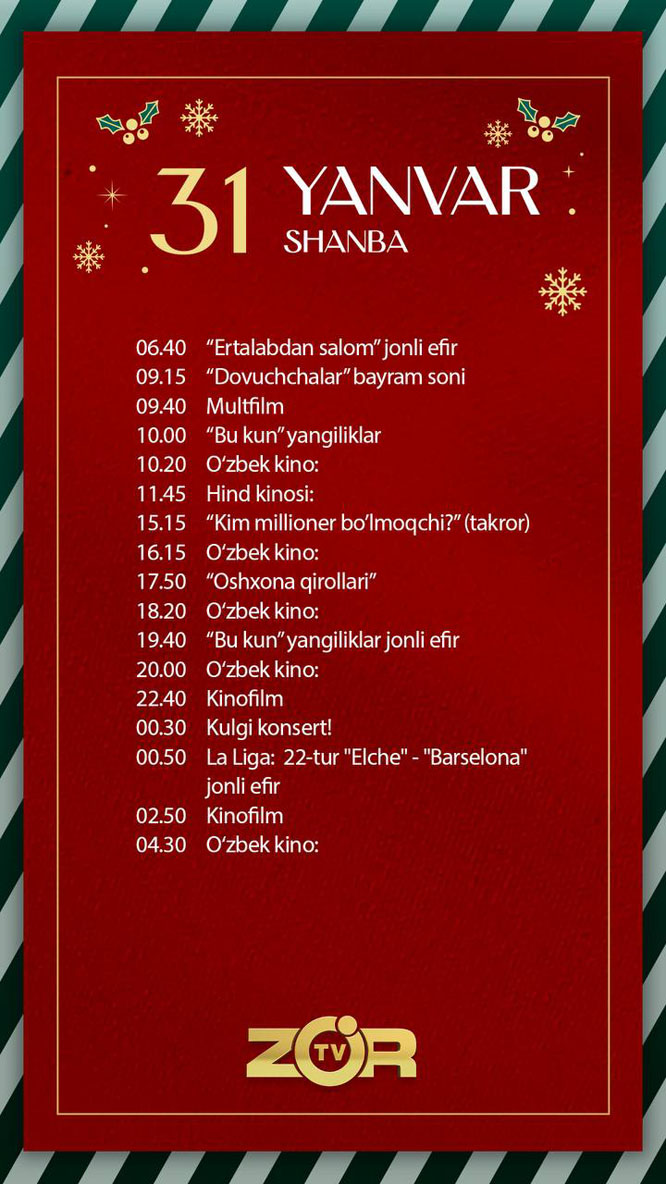 Zo'r TV телеканали бугун — 2026 йил 31-январь, шанба куни қуйидаги кўрсатув ва трансляцияларни эфирга узатишни режалаштирган.