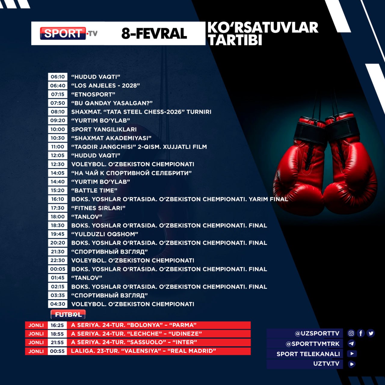 Sport ва Futbol телеканаллари бугун — 2026 йил 8-февраль, якшанба куни қуйидаги кўрсатув ва трансляцияларни эфирга узатишни режалаштирган.
