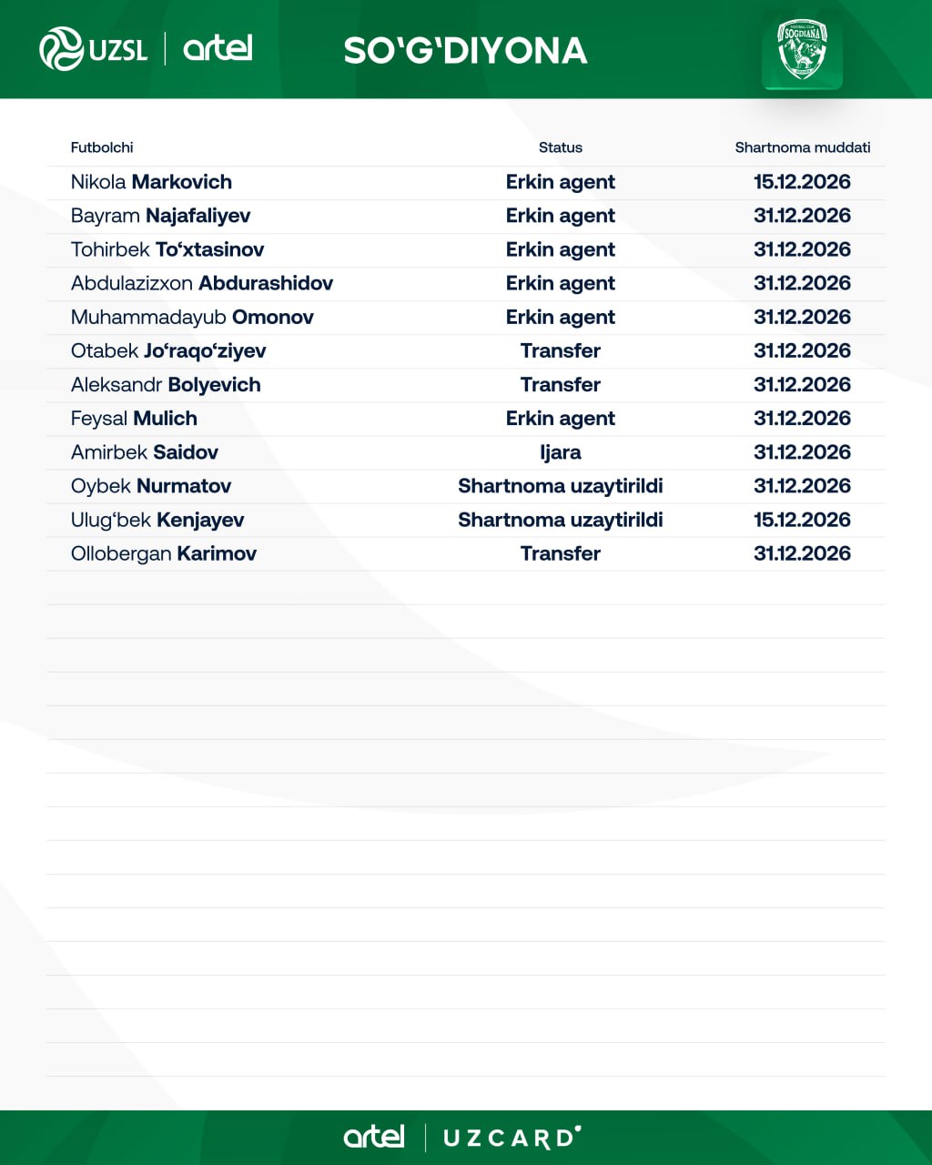 6 нафар футболчи эркин агент сифатида жамоага келиб қўшилган бўлса, 2 нафар футболчи билан шартнома узайтирилди. 3 та ўйинчи жамоага янги трансфер қилинди ва 1 нафари ижара асосида ўйнайди.