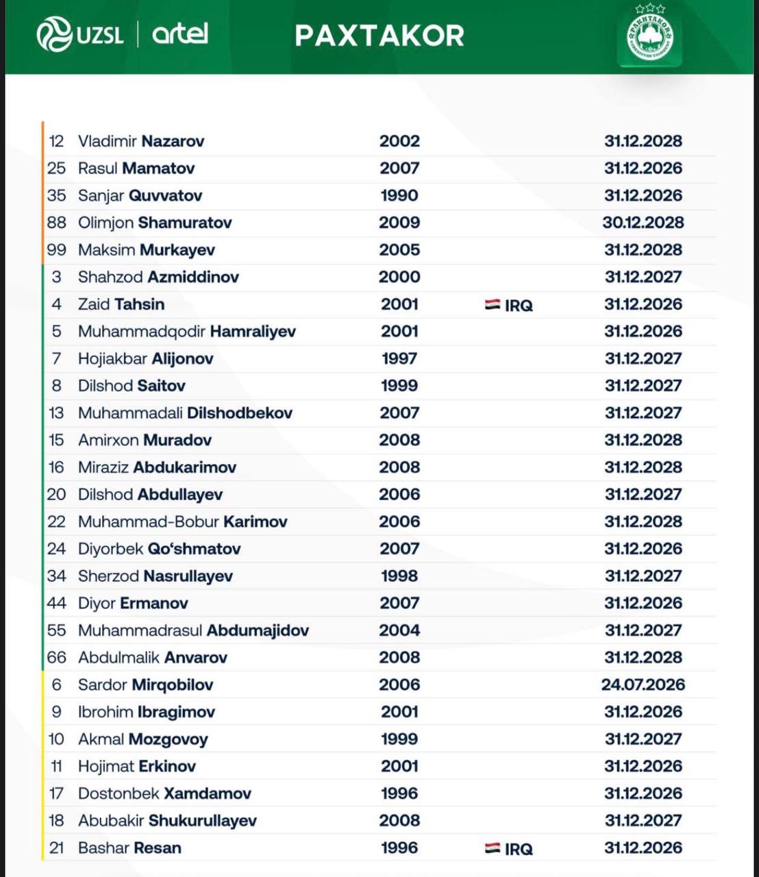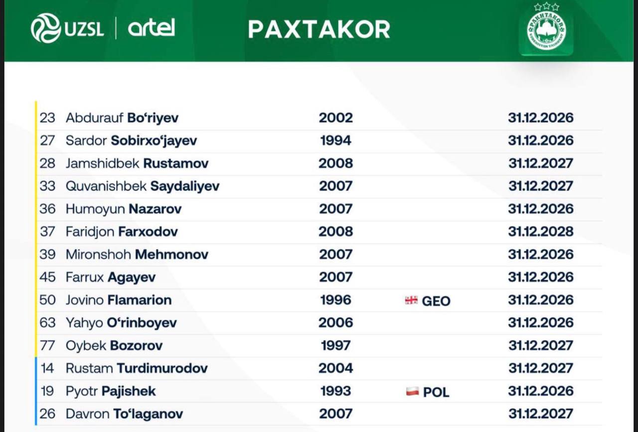 Тошкентнинг "Пахтакор" клуби янги мавсум учун 41 нафар футболчини рўйхатдан ўтказди.