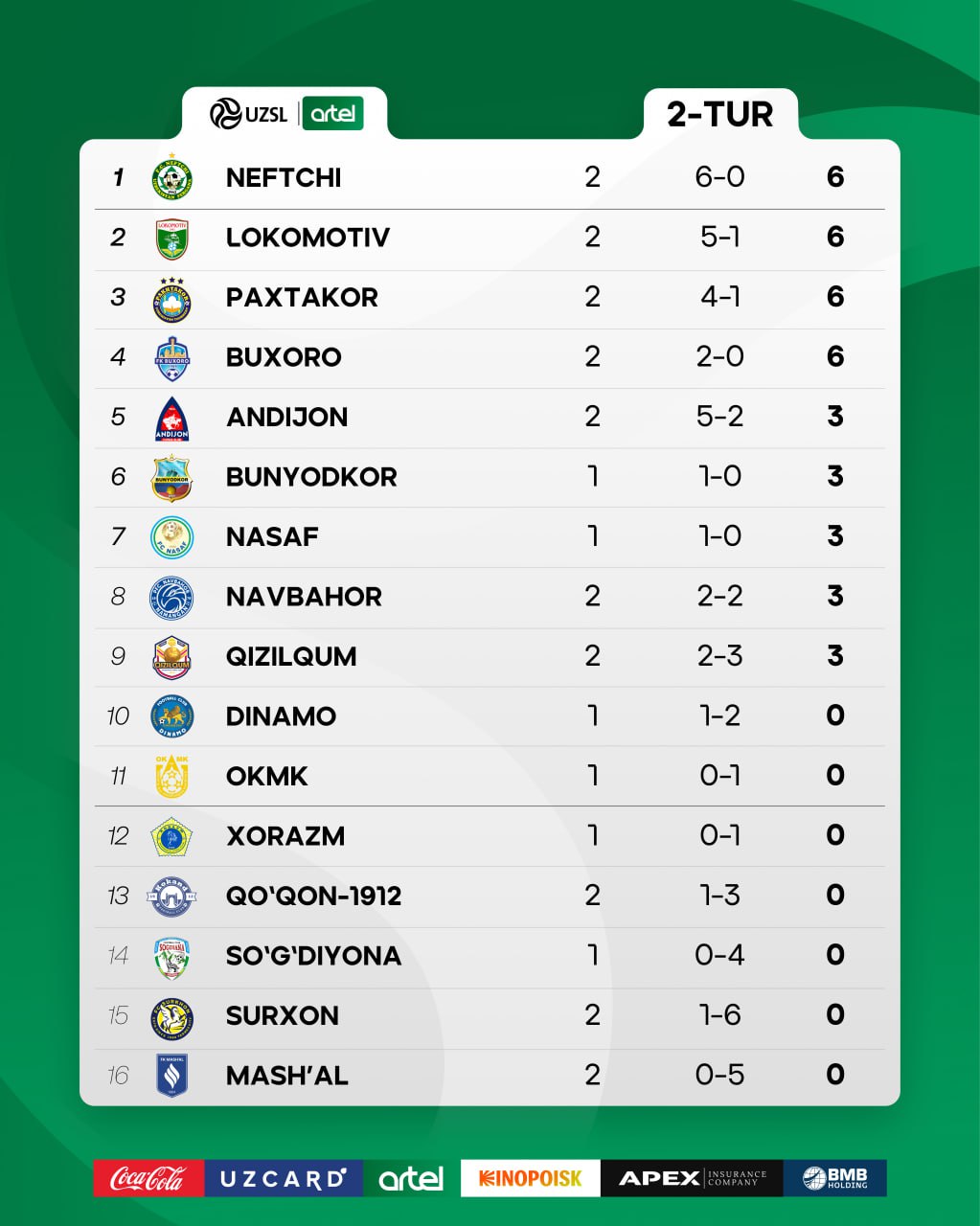 Ўйинларда қайд этилган натижалар ва турнир жадвалидаги ҳолат билан танишинг: