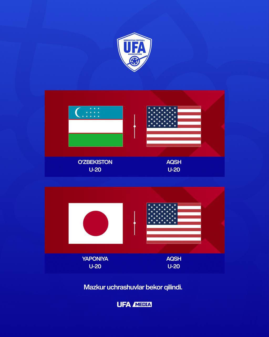 АҚШ томони барча терма жамоаларининг ўқув-машғулот йиғинларини вақтинча тўхтатиб туриш бўйича қарор қабул қилди. Шу сабаб АҚШ U-20 терма жамоасининг Тошкентдаги ўқув-машғулот йиғини ҳам номаълум муддатга қолдирилган.