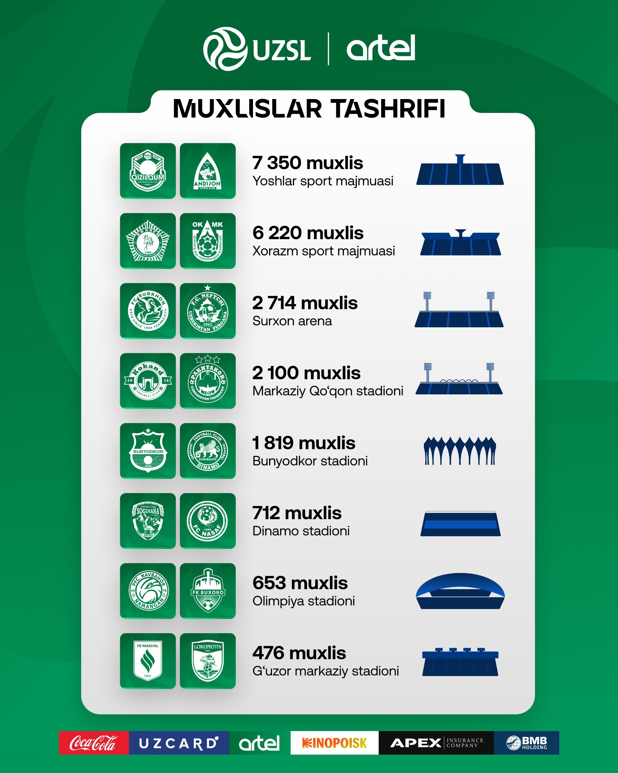 Ушбу турда энг кўп томошабин "Қизилқум" - "Андижон" учрашувида кузатилди. Ўйинни стадиондан туриб бевосита 7350 нафар ишқибоз кузатиб борган.