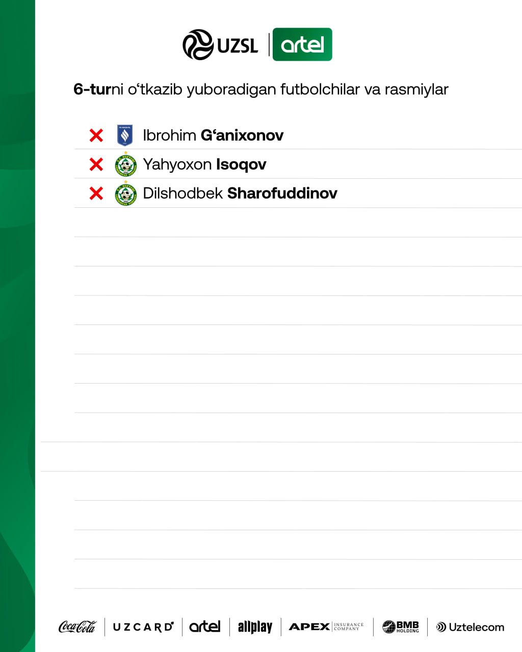 Суперлига. 6-турни ўтказиб юборадиган футболчилар рўйхати эълон қилинди