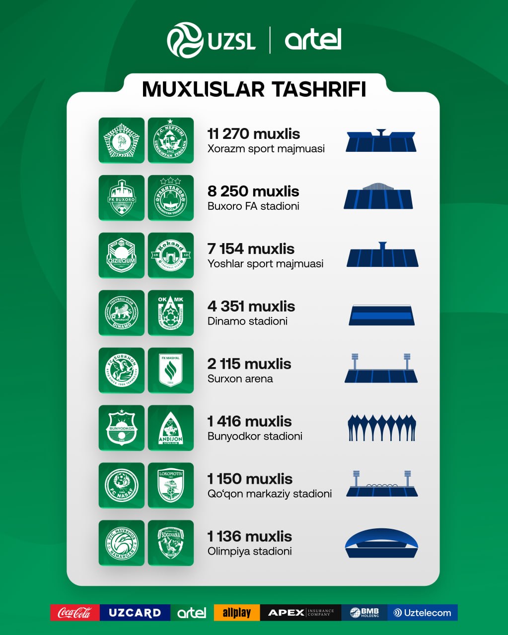 Фарғоналиклар 2:0 ҳисобида ғалаба қозонган баҳсни Хоразмдаги стадиондан бевосита 11 270 нафар мухлис кузатиб борган.