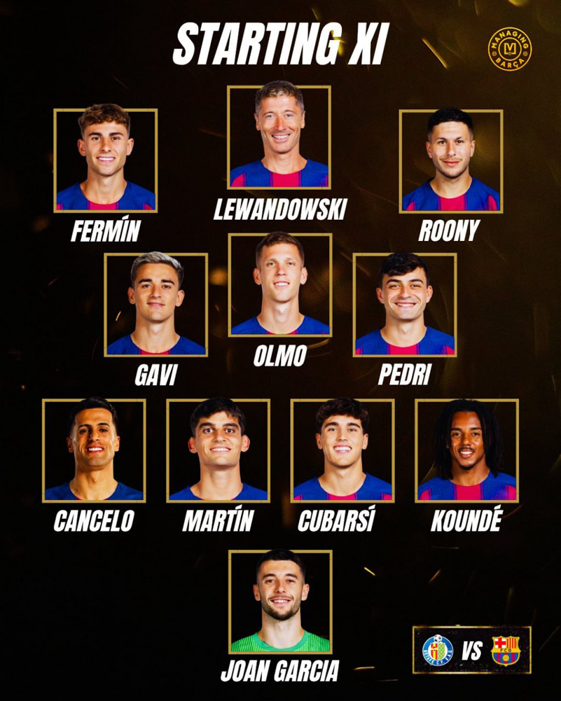 "Барселона": Жоан Гарсия, Жюль Кунде, Пау Кубарси, Жерар Мартин, Жаоу Канселу, Педри, Дани Ольмо, Гави, Руни Бардагжи, Фермин Лопес, Роберт Левандовски